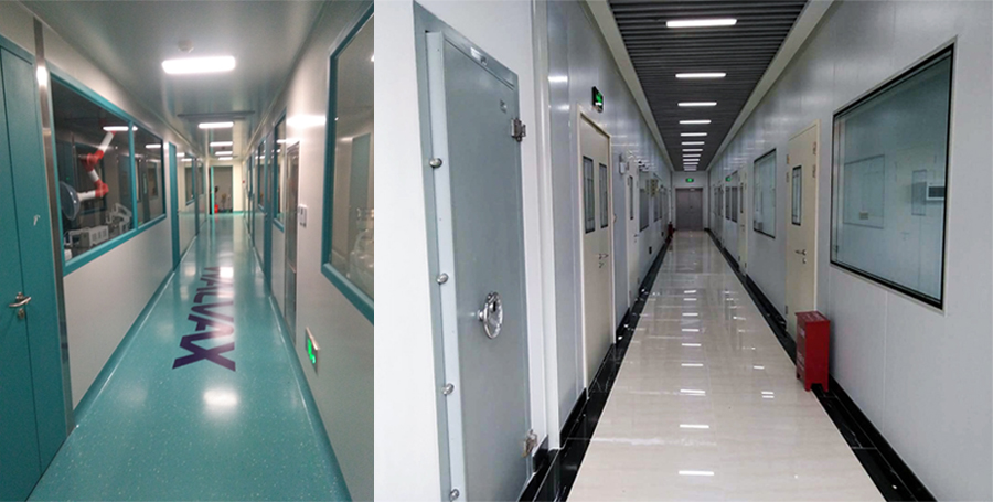 三层过道,实验室墙体为玻镁彩钢板,并设置了观察窗,方便外来参观人员考察、学习。两侧的门采用不锈钢门套,甲级防火子母木门,满足了消防要求的同时也满足了使用功能。顶面采用石膏板加铝方通的形式吊顶,地面为米白色地砖及米黄色地砖波导,整体空间明亮、干净、整洁。