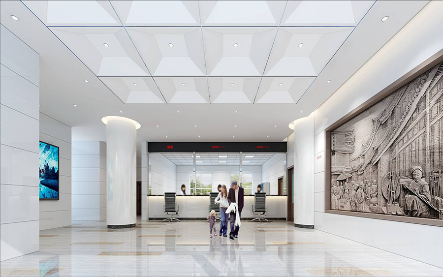 大厅顶面设计了凹槽造型,使得层高再次拔高。墙面采用大面积白色面砖,而横向留缝又在视觉上拉伸了整个空间。地面采用灰木纹与黄木纹交错拼贴,整体色调以米白、米黄为主,干净且大气。而进门右侧的古铜浮雕墙,更是充分展现出了玉溪人的文化特色。