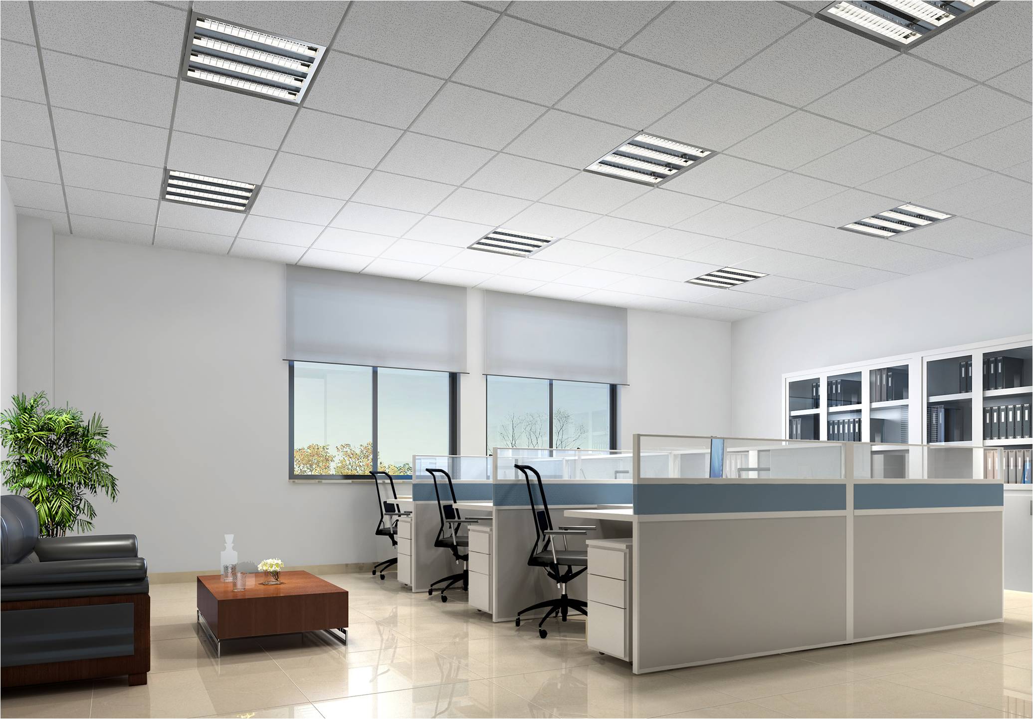 标准办公室,使用面积25㎡左右,配置办公桌、文件储存柜、接待区。其地面为米白色面砖,乳胶漆墙面,矿棉板吊顶。办公环境宽场明亮。