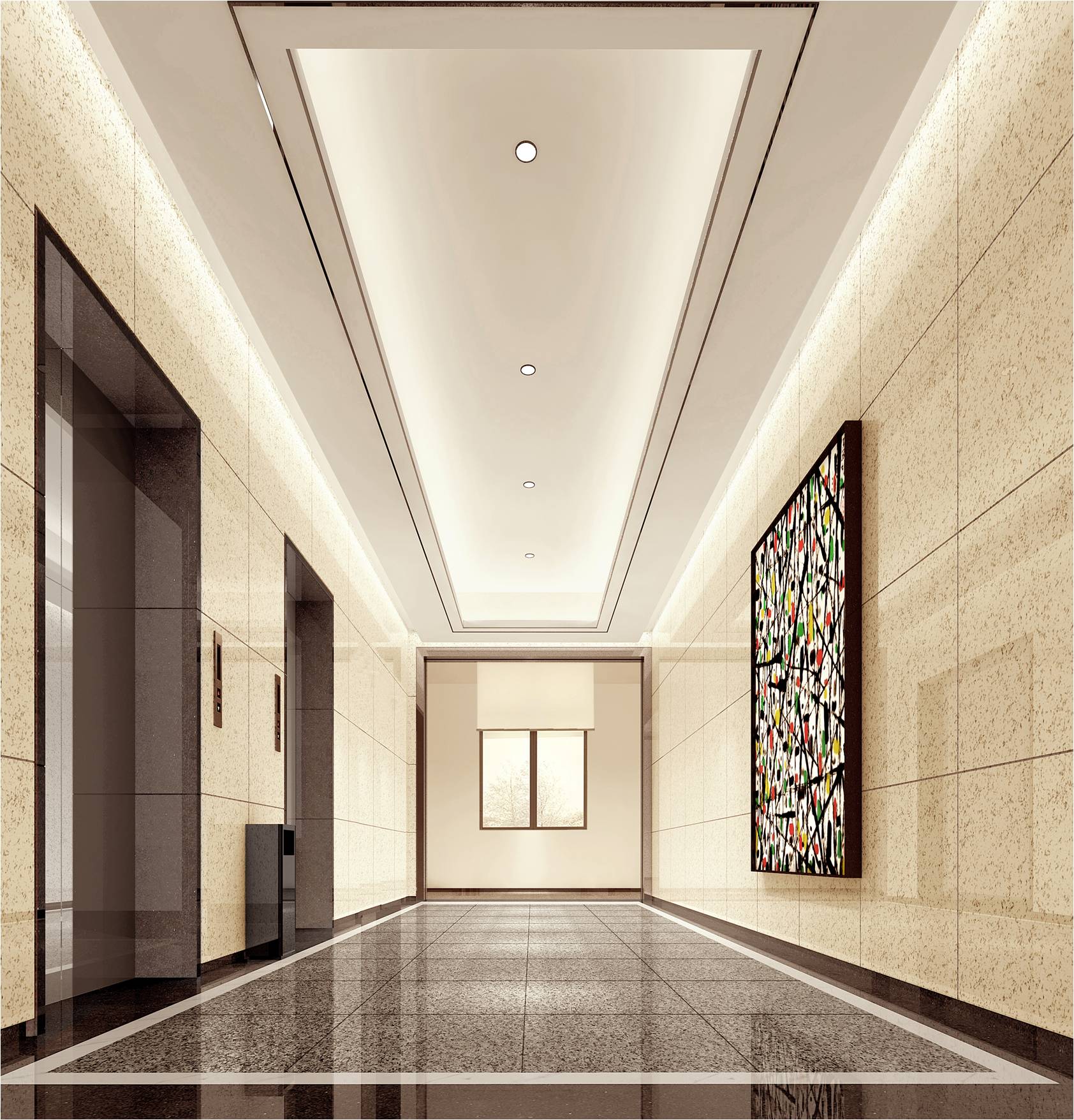 合用前室兼候梯厅,净宽2.7m,厅一侧为两个电梯门,另一侧墙体设装饰雕花背景。墙体采用米黄色仿石材,地面、踢脚线及电梯门套均采用咖啡色仿石材,吊顶设计槽灯和顶灯,现代简洁、宽敞舒适。