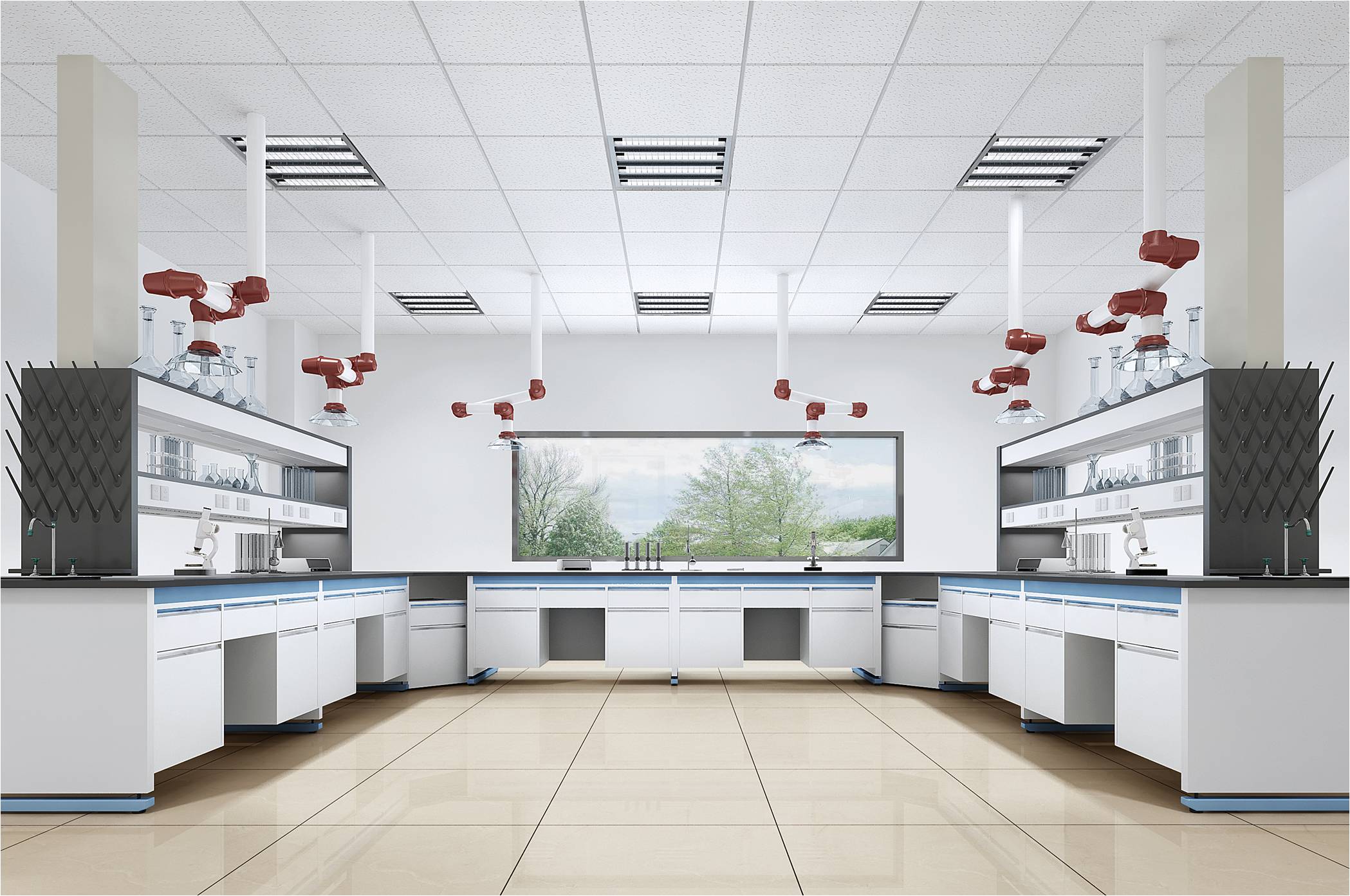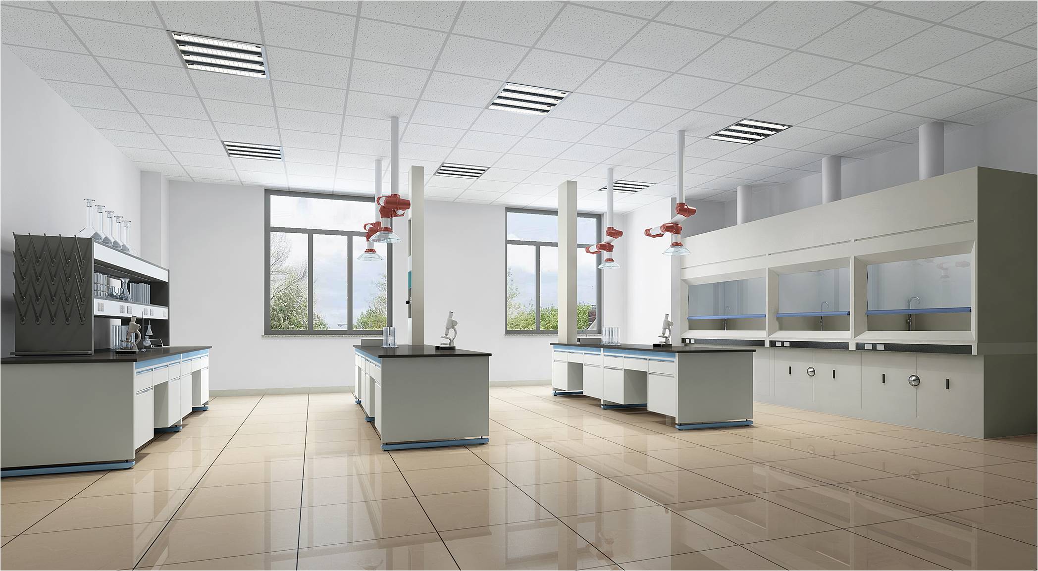 原吸+重金属实验室,使用面积55㎡左右,四排实验台设计。其地面为米白色面砖,乳胶漆墙面,矿棉板吊顶。