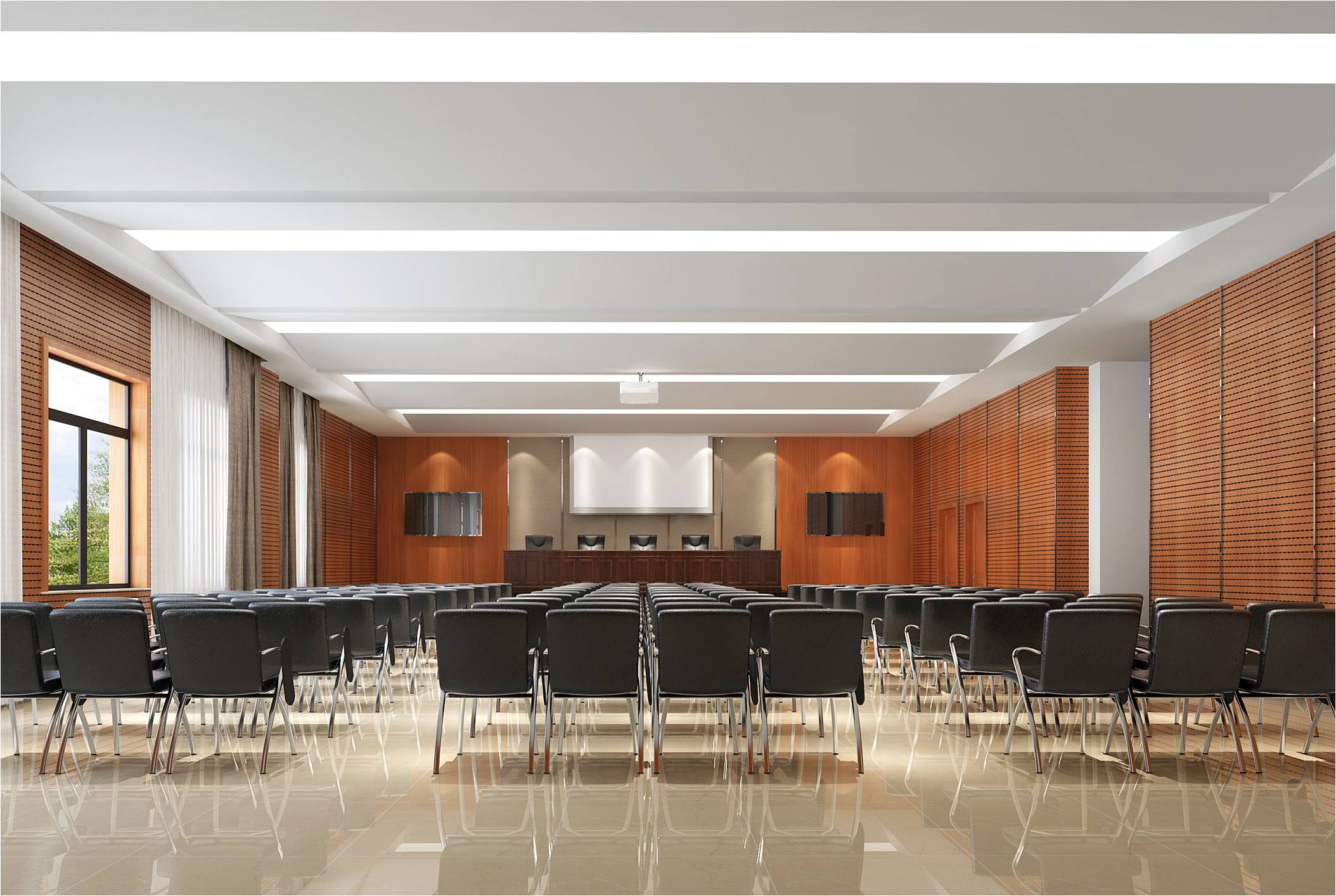 十五层多功能报告厅,使用面积约170㎡左右,可容纳120人。其地面采用米白色面砖,木纹条形吸音板墙面,纸面石膏板造型吊顶。空间敞亮规整,隔音效果佳。